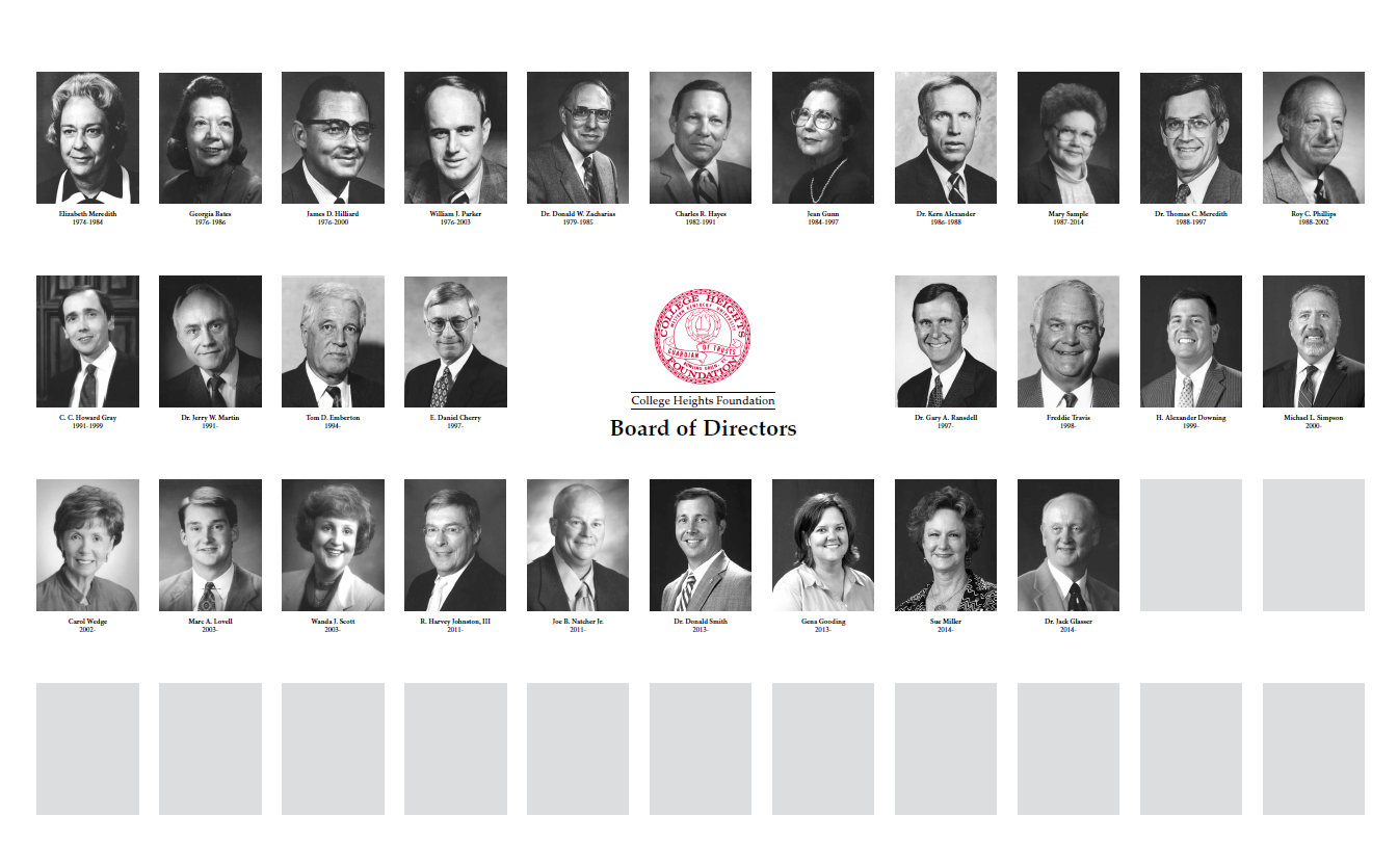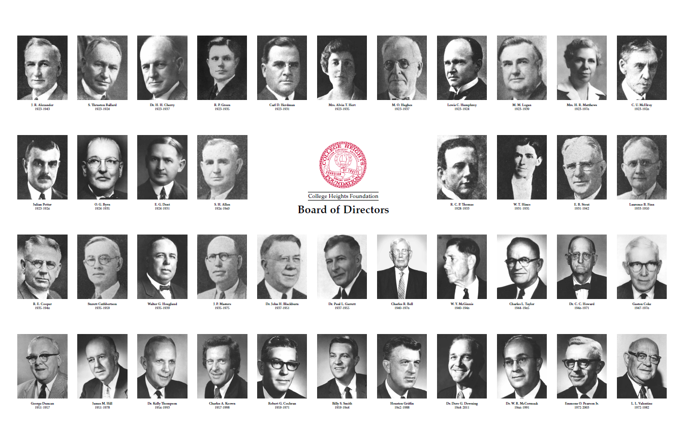 Since the Foundation's founding in 1923, a Board of Directors made up of twelve prestigious members has governed over College Heights to make decisions and ensure its perpetual success. These members serve without remuneration and are a major component to the legacy that is College Heights Foundation.