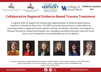 A regional effort to support the training and implementation of evidence-based trauma treatment in the Barren River Area. The CRETT promotes best practices in child welfare by providing evidence-supported trauma-specific training, consultation, education, and support to clinicians focused on measurement-based care, managing secondary traumatic stress and moral injury, court involvement, and interdisciplinary service delivery.