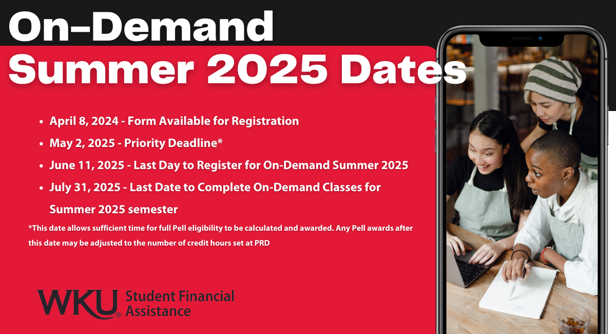 WKU On Demand courses may be covered by financial aid if the student has met basic eligibility requirements*, has a current FAFSA on file, has completed requests for any/all additional requirements (tax information, verification, probation counseling, etc.), and has completed an online WKU On Demand Agreement with the Department of Student Financial Assistance.