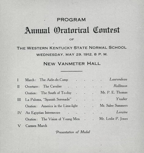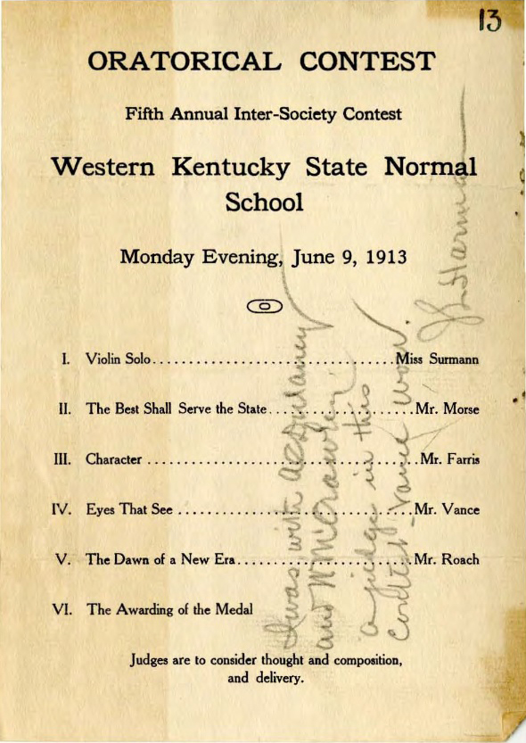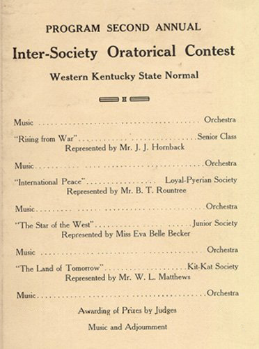 - The event program was apparently mis-labeled as "Fifth Annual"; For a first list of competitors, Western Kentucky University, "UA12/1/1 Elevator, Vol. IV, No. 8" (1913). WKU Archives Records. Paper 1922. http://digitalcommons.wku.edu/dlsc_ua_records/1922; For the final list, the winner, and a copy of the winner's speech, Western Kentucky University, "UA12/1/1 Elevator, Vol. IV, No. 9" (1913). WKU Archives Records. Paper 1933. http://digitalcommons.wku.edu/dlsc_ua_records/1933