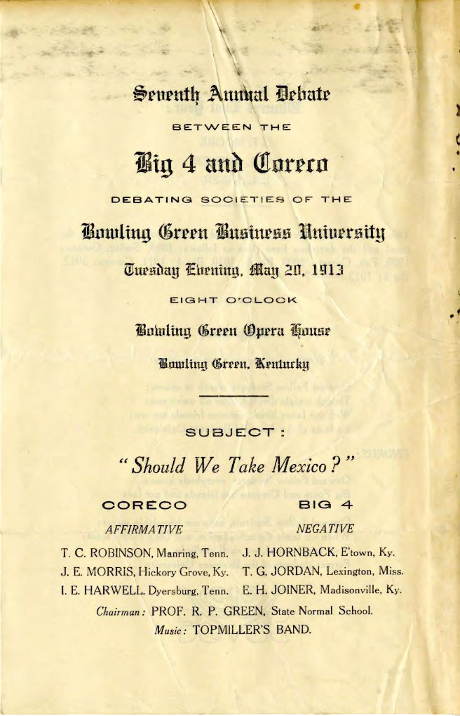 Records suggest that 1908 marks the first of a line of annual debates between the two debating societies of the Bowling Green Business University, named Big Four and Coreco. This school was located near downtown Bowling Green. Considering that the historical trajectory of the Business University was mostly parallel to that of the rest of Western for the next fifty years, we will not include much more of BGBU here. A copy of a later (1913) BGBU debate program can be found further below. Some students of the Western Kentucky State Normal School moved on to Bowling Green Business University to augment their studies. This could bring a student to be involved in competitive debate at both the Normal School and at BGBU. To add, in the late 1940s, after a long lull in Western debate, the debate societies of the two schools engaged in exhibition debates.