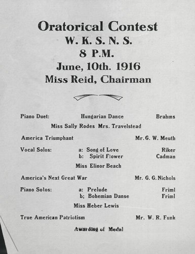 Click on the program on the right for a full version. Contestants in the Second Annual Inter-Society Oratorical: John J. Hornback (senior), Miss Eva Belle Becker (junior), Mr. W.L. Matthews (Kit Kats), and Mr. Bert T. Rountree. The winner of this 1911 contest, W.L. Matthews, may have moved on to an interstate oratorical contest. Five months before this June contest the college's monthly student publication claimed exactly that.14 Whether this contest, or any of these inter-society contests, acted as a qualifier for a more prestigious contest has not yet clear. Originally, the Pyerian class provided its own orator--Miss Marion Simpson--but the program below indicates that the Loyals representative ended up representing both classes instead."14 Why this occurred is not known.