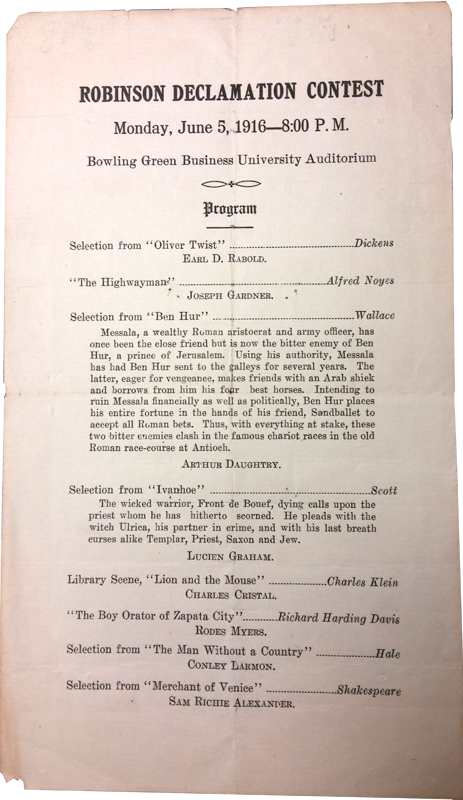 Debate, oratory, and what a reader of 2016 would recognize as interpretive reading all began on The Hill at around the same time. The 1899 competition in elocution featured reading aloud from literature for emotional and contemplative impact. By 1916, the then-decades-old Robinson Declamation contest certainly featured the same, but whether that was the original content of the 1885 contest remains unknown.