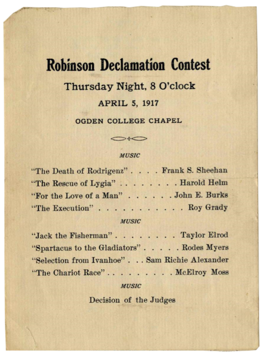 For the first decade and a half, we know of only Ogden College's intramural oratorical contests.