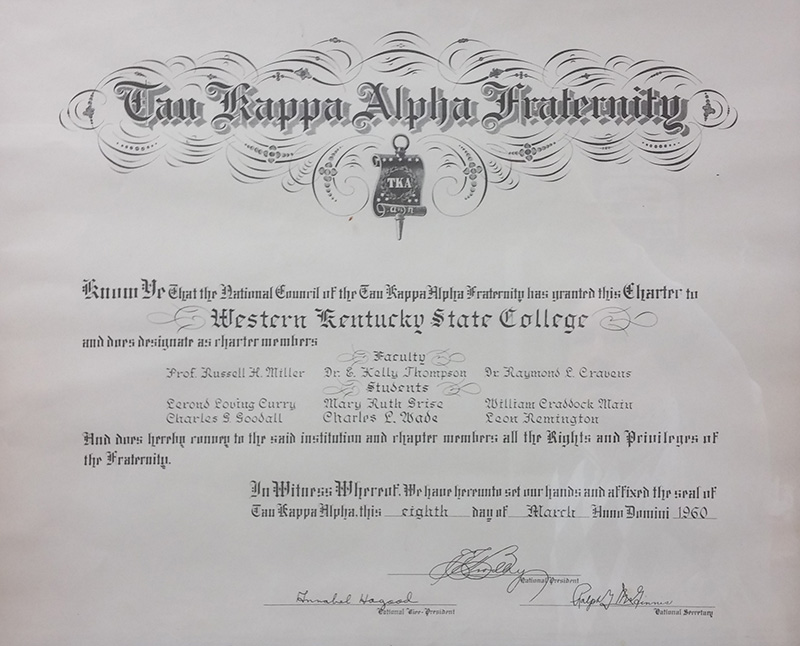 On 8 March 1960 WKU joined Tau Kappa Alpha, a national forensic-related fraternity.