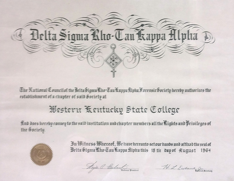 On 18 August 1964 WKU joined Delta Sigma Rho-Tau Kappa Alpha, a forensic fraternity.