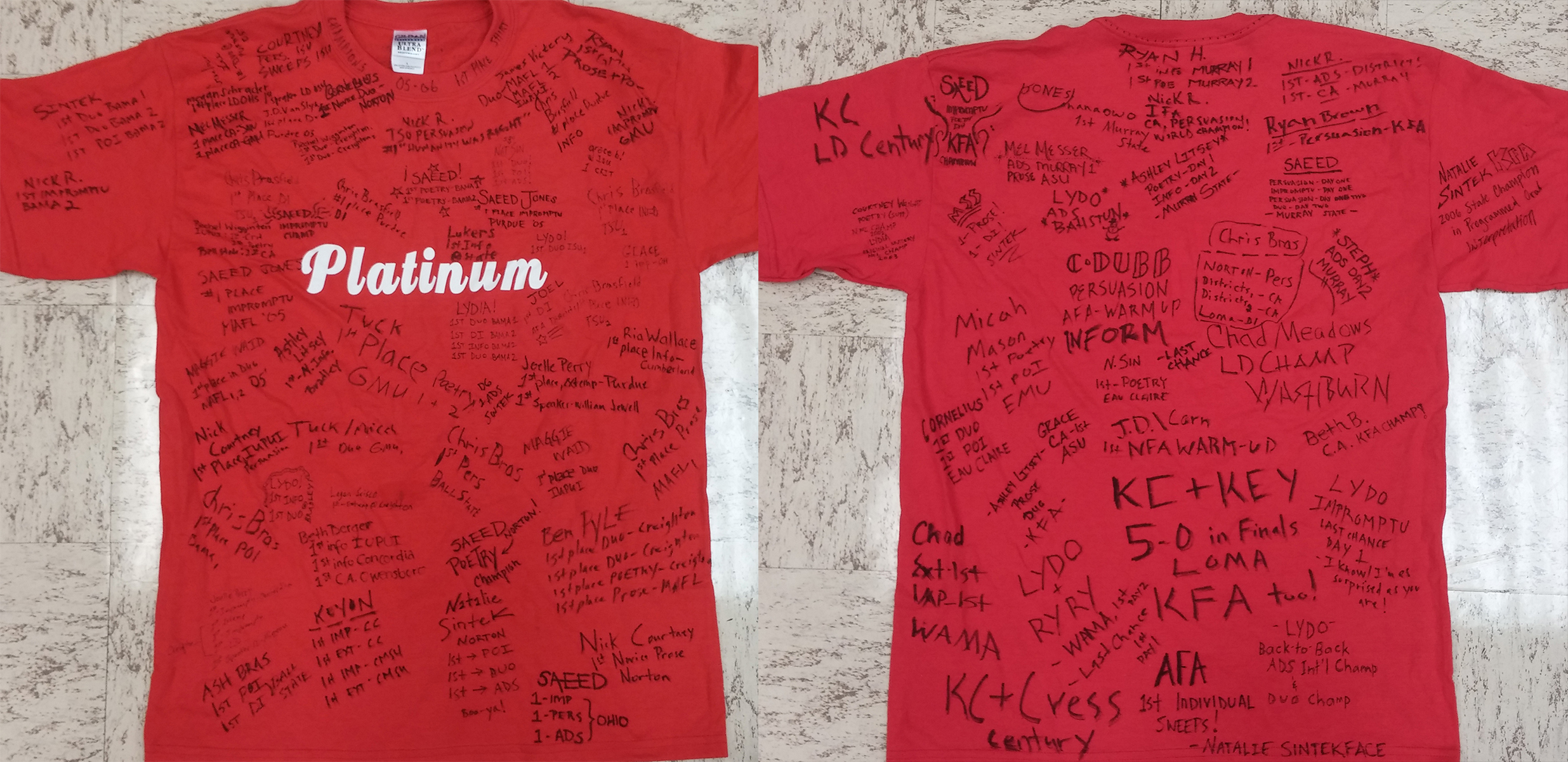 Roster: Dontarius Bailey, Beth Berger, Brian Bloss, Jeffrey Boggess, Jason Carey, Michael Courtney, Jerome Davis, Joele Denis, Jessica Furgerson, Desiree Guerrero, Carrie Guggenmos, Chelsea Harman, Samantha Harrison, Josh Harzman, Kelcy Hathaway, Adam Heugel, Drew Horner, Colby Holt, Kaleb Jessee, Dan Johnson, Saeed Jones, Cornelius Lee, Kelly Lootz, Micah Mason, Chad Meadows, Brandon Merrell, Ethan Millspaugh, Rachel Mosley, Liz Mullins, Lauren Nelson, Lydia Nelson, Ganer Newman, Logan Parke, Seth Peckham, Ben Pyle, Todd Rainey (now Emma Rainey), Josh Ramsey, Tom Schally, Natalie Sintek, Sarah A. Spiker, Robert Strobel, Adam Swanson, Alex Traxler, Ben Unanaowo, John D. VanSlyke, Maggie Waid, Robert Whittley, Rachel Wigginton, Amber Williams; Adam Black (part time), Jon Carter (coach), Chris Chandler (KHSSL), Justin Cress (grad asst), Rafael Esparza (grad asst), Chris Joffrion (coach), Brooks Johnson (grad asst), Wendy Kelley (office), Dawn Lowry (coach), Jace T. Lux (ADoF), Carrie Menapace (Brunder; grad asst), Stephanie Patterson (Alderdice), Glenn Prince (debate director), Frank Rivera (grad asst), Ben Robin (coach), Judy Woodring (director)