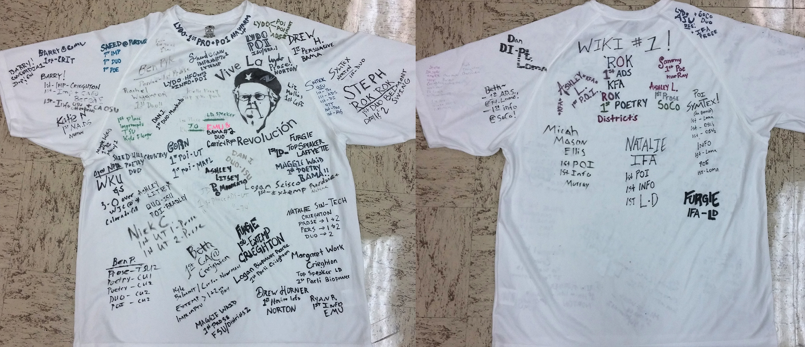 Roster: Celena Allen, Brian Bloss, Jeff Boggess, Jason Carey, Michael Courtney, Jerome Davis, Joele Denis, Jessica Furgerson, Corey Gomez, Taron Grizzell, Desiree Guerrero, Carrie Guggenmos, Chelsea Harman, Samantha Harrison, Joshua Harzman, Kelcy Hathaway, Chris Hiller, Colby Holt, Kaleb Jessee, Cornelius Lee, Ashley Litsey, Kelly Lootz, Ethan Millspaugh, Liz Mullins, Frank Murdock, Katie Nedvidek, Lauren Nelson, Ganer Newman, Mario Nguyen, Logan Parke, Seth Peckham, Todd Rainey (now Emma Rainey), Lillian Schoer, Khristan Solliday, Sarah A. Spiker, Rog Strobel, Adam Swanson, John D. VanSlyke, Matt Whitman, Robert Whittley, Rachel Wigginton, Maggie Woodward, Alex Wozencraft; Stephanie Alderdice (nee Patterson; coach), Beth Berger (grad asst), Adam Black (part time), Chris Chandler (coach), Justin Cress (grad asst), Jesse Gall (grad asst), Chris Joffrion (debate director), Brooks Johnson (grad asst), Wendy Kelley (office), Dawn Lowry (coach), Jace T. Lux (ADoF), Chad Meadows (grad asst), Frank Rivera (grad asst), Ben Robin (coach), Maggie Waid (vol), Judy Woodring (director)