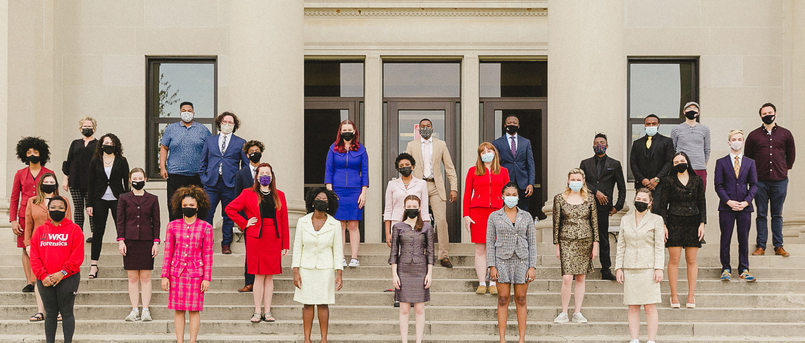 Most tournaments were online. Thus the Asynchronous Speech Championship was devised, and the below photo (sample2) shows the WKU competitors: (back l-r) Dakota Perry, Collin Tuerk, Caitlyn Woitena, Danielle Williams, Reese Johnson, Jaleon Brown, Christian Butterfield, Chad Meadows (debate dir); (2nd) Ganer Newman (director), Jonah Johnson, Shainna Ralston, Antonina Clementi, Rachel Akinbayo; (front) Rashon Leday, Samantha Sallee, Paige Allbright, Kellin Robinson, Tani Washington, Joseph Eberle