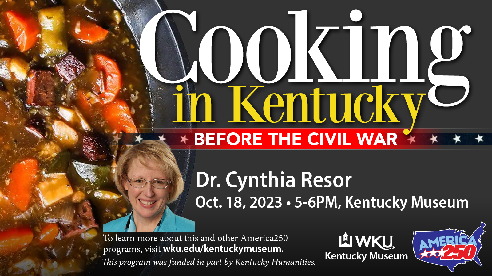 Presentation by Dr. Cynthia Williams Resor, Foundation Professor, College of Education, Eastern Kentucky University. This program will explore the lives of Kentucky women, free and enslaved, as Resor prepares recipes from early nineteenth century cookbooks such as Lettice Bryan’s The Kentucky Housewife. Reviewing how women produced, preserved, and prepared food in pre-industrial kitchens, Resor explores the often-overlooked “women’s work” of the past and present and how teaching it can enhance our understanding of everyday Americans.