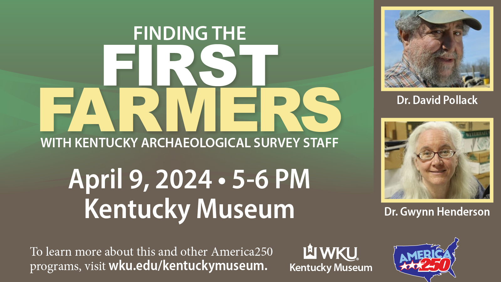 Finding the First Farmers with Kentucky Archaeological Survey staff and guest curators: Dr. David Pollack, and Dr. A. Gwynn Henderson.Panelists from the Kentucky Archaeological Survey (KAS) will discuss the diverse nature of indigenous farm life in the Barren River drainage of south-central Kentucky during the Mississippian era. Exploring recent archaeological finds, the team will expand on the First Farmers of the Barren River Valley exhibition at the Kentucky Museum to address misconceptions on indigenous peoples’ identity, technology, settlement patterns, foodways, and trade routes to reveal the complex societies present before Europeans arrived in what is now North America. They will also explore the similarities between indigenous farmers and Kentucky farm families of the late nineteenth to early twenty-first centuries.