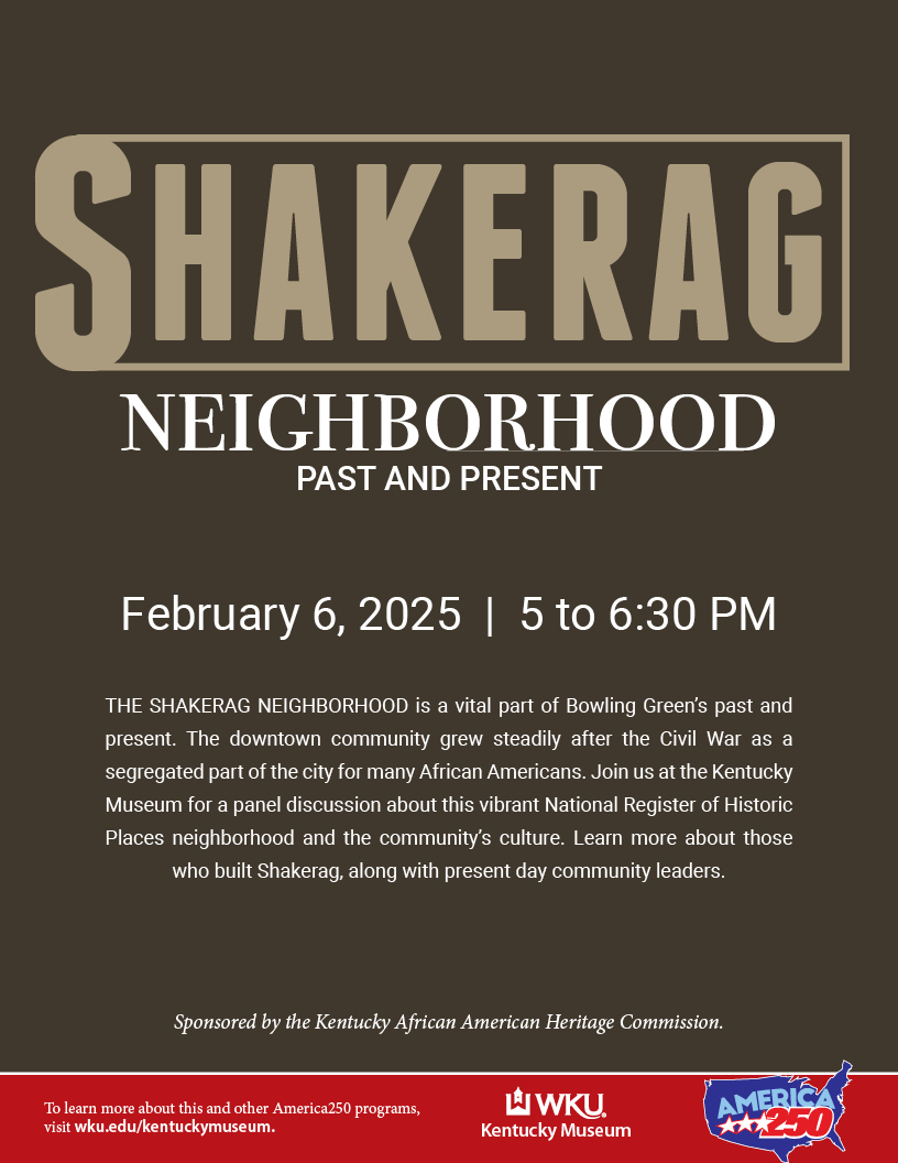 The Shake Rag neighborhood is a vital part of Bowling Green’s past and present. The downtown community grew steadily after the Civil War as a segregated part of the city for many African Americans. Join us for a panel discussion about this vibrant National Register of Historic Places neighborhood and the community’s culture. Learn more about those who built Shake Rag, along with present day community leaders with panelists: