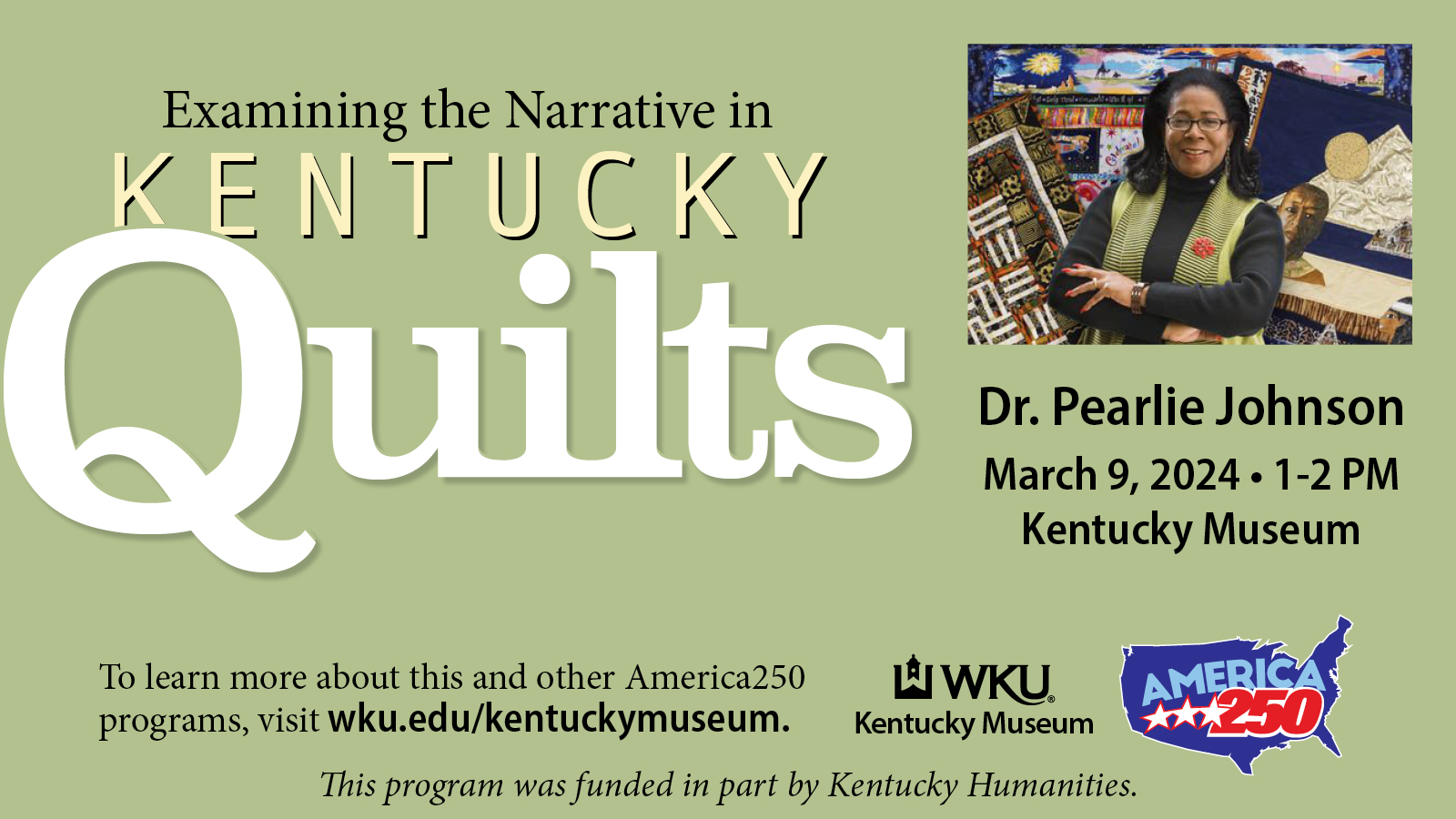 Presentation with Dr. Pearlie Johnson, Independent Scholar and member, Kentucky Humanities Council’s Speakers Bureau. Based on historical records, secondary sources, and oral history interviews with quilters across Kentucky, Johnson discusses 19th century quilts made by black women living and working on slave plantations, traditional quilts made by African American women of the 20th century, as well as contemporary art quilts made by women of all cultural groups of the 21st century. Her work explores women’s history, storytelling, identity politics, social activism, and empowerment. Her study of quilts in Kentucky is aimed at examining cross-cultural parallels in technique and assemblage, as well as revealing unique designs.