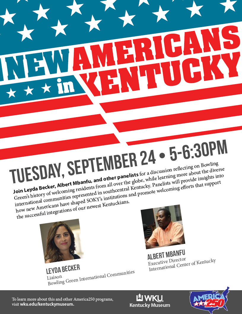 Join panelists for a discussion reflecting on Bowling Green’s history of welcoming residents from all over the globe, while learning more about the diverse international communities represented in southcentral Kentucky. Panelists will provide insights into how new Americans have shaped SOKY’s institutions and promote welcoming efforts that support the successful integrations of our newest Kentuckians.