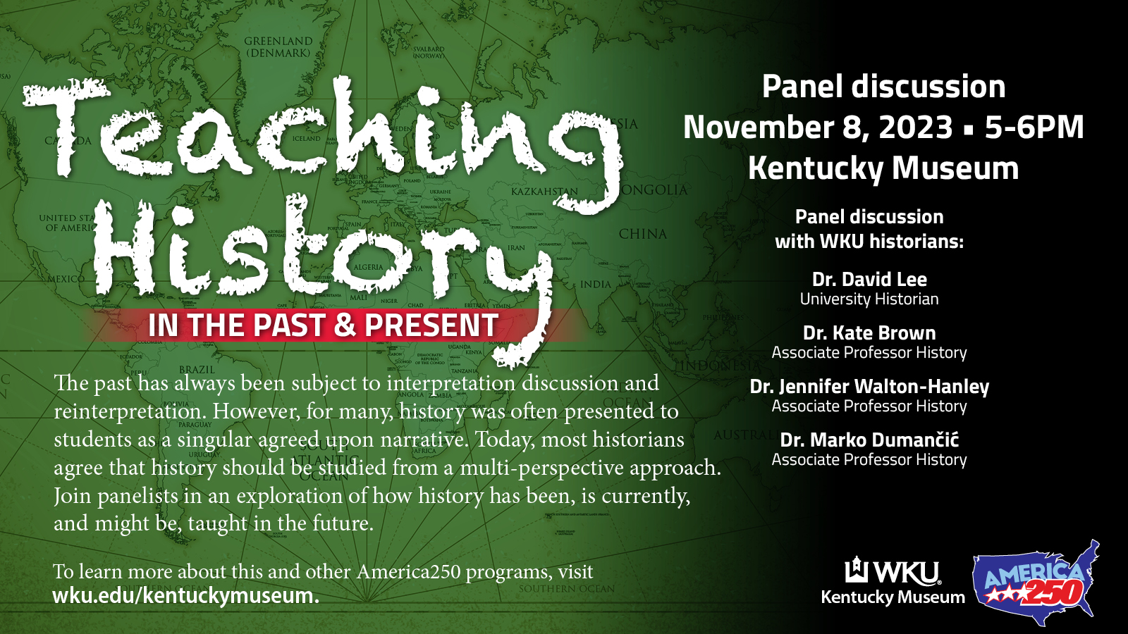 Panel discussion with WKU historians Dr. David Lee, University Historian; Dr. Kate Brown, Associate Professor, History; Dr. Jennifer Hanley, Associate Professor History; and Dr. Marko Dumančić, Director, Center for Innovative Teaching and Learning. The past has always been subject to interpretation discussion and reinterpretation. However, for many, history was often presented to students as a singular agreed upon narrative. Today, most historians agree that history should be studied from a multi-perspective approach. Join panelists in an exploration of how history has been, is currently, and might be, taught in the future.
