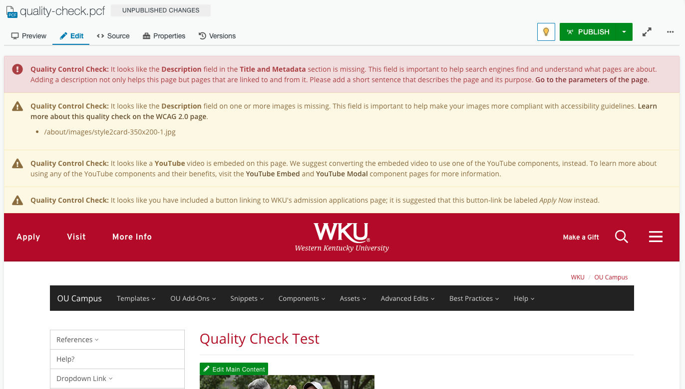 Quality Control Checks were created to help guide content editors improve aspects of the page. These messages detect content on the page for things that may be missing or need modified to improve SEO, usability, and consistency across WKU website.